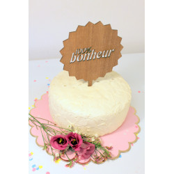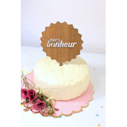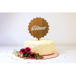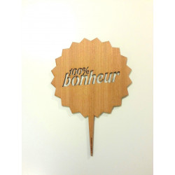 Cake topper en bois avec sa pique, découpe centrale 100% Bonheur, plaquage bois couleur "cèdre" sur le recto.