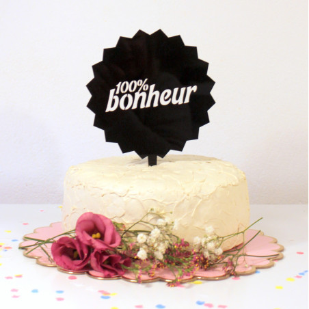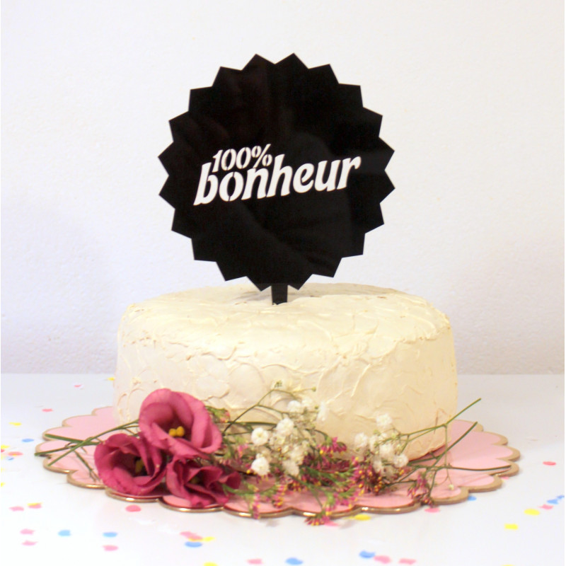 Déclarez votre joie avec cette figurine de gâteau 100% Bonheur, pour un mariage, un baptême, une baby shower ou encore un anniversaire ! Le bonheur est là, dites-le avec cette ravissante décoration à piquer sur votre gâteau de fête. Réalisation artisanale, en acrylique, de couleur noire.