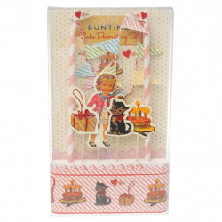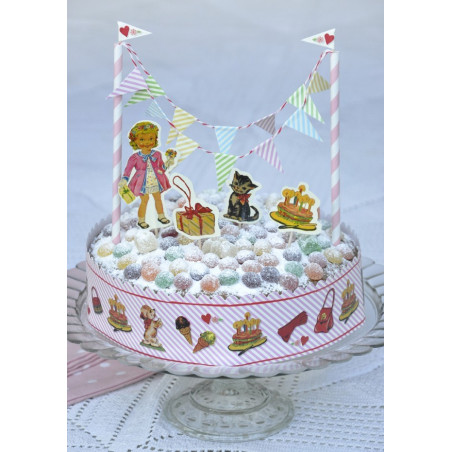 Composé d'une mini guirlande de fanions entre deux pailles rétro, de petits drapeaux sur piques et d'un beau ruban pour le tour de gâteau, ce set furiseusement rétro décorera avec charme et fantaisie tous vos gâteaux pour toutes les fêtes et goûters d'anniversaire de petite fille. Parfait pour la décoration des gâteaux d'anniversaire fillette ou encore en cake topper tendance pour un goûter d'enfants aux accents rétro.