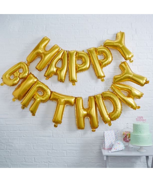 Une guirlande anniversaire originale composée de ballons en forme de lettres avec les mots Happy Birthday. Cette guirlande Happy Birthday avec des ballons mylar doré aux effets métalisés sera parfaite pour votre décoration d'anniversaire. Gonflez les ballons avec une paille glissée dans l'ouverture de chaque ballon.